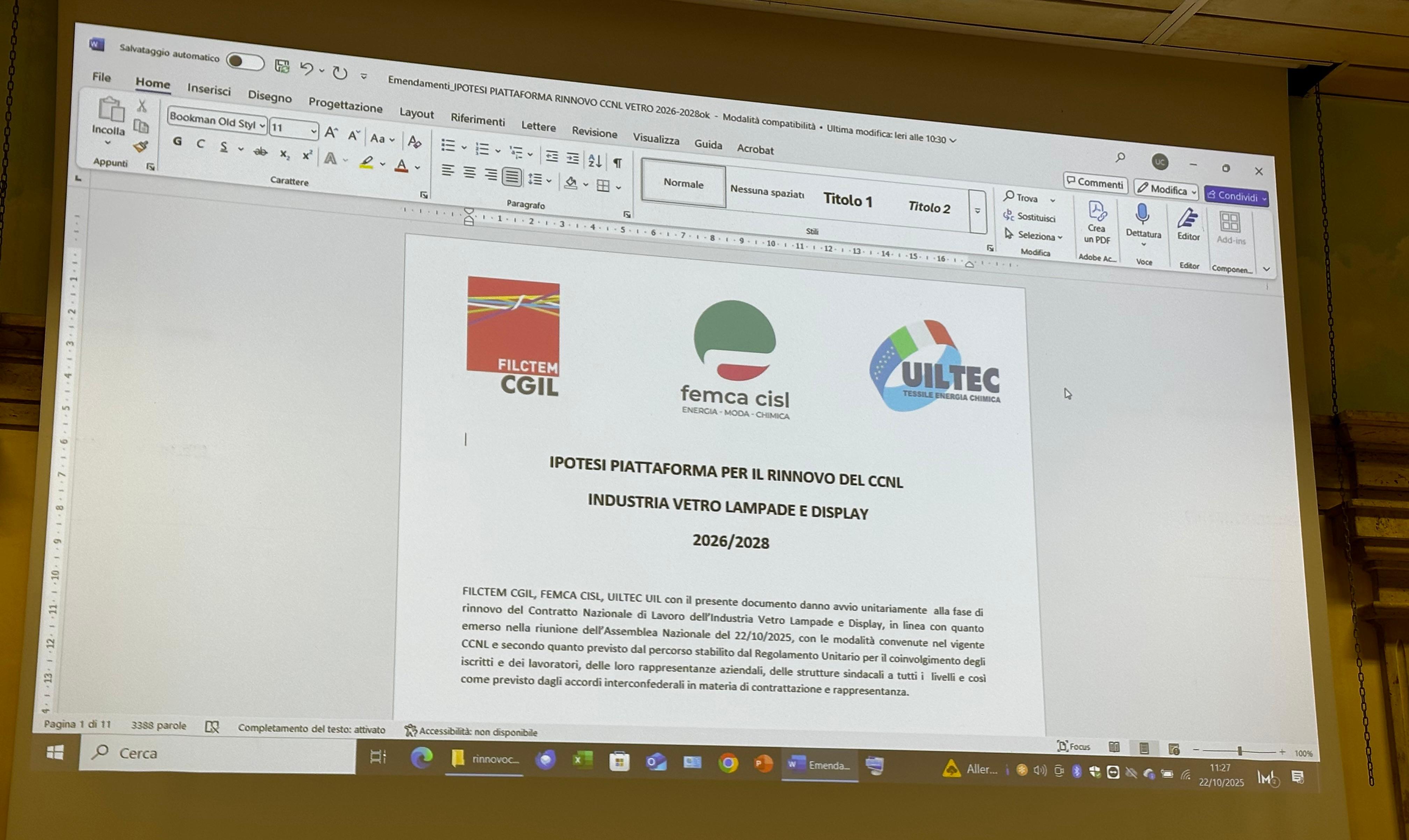 Questa mattina, a Roma, la delegazione trattante della Filctem Cgil, Femca Cisl, Uiltec Uil del contratto nazionale di lavoro Vetro Lampade e Display, in scadenza il prossimo 31 dicembre, ha varato la piattaforma rivendicativa di rinnovo per il triennio 2026-2028. Nel settore vetraio in Italia operano quasi 28mila dipendenti.